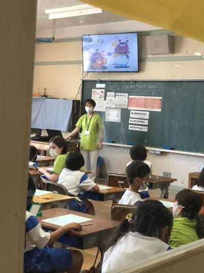今回は1年生を対象に3コマ。児童らに理解してもらいやすいようにと若いDHらの応援も頼んでいました。心配は無用、堂々たる?授業っぷりで子供達の目線を引き付けていましたね!